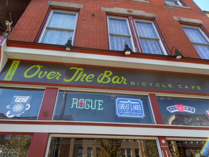 Over the Bar, Bicycle Cafe, hand-painted storefront sign…
