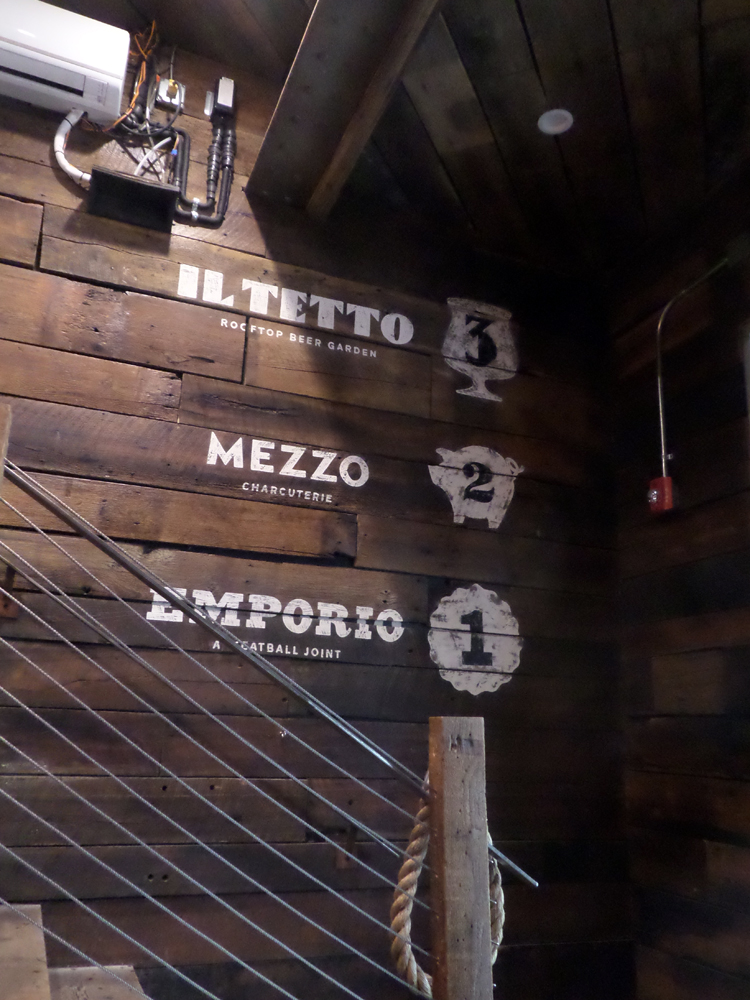 Hand-painted word marks, Mezzo stairwell, Sienna Mercato restaurant…