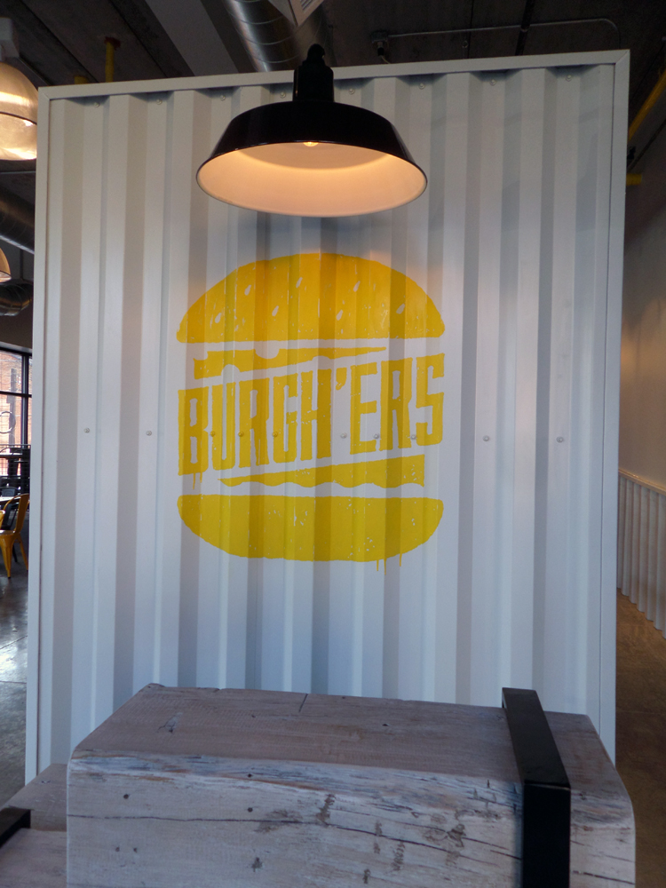 Hand-painted logo on metal with heavy corrugation, Burgh’ers, Lawrenceville…