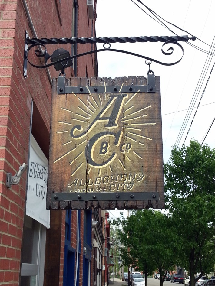 Double-sided blade sign made from reclaimed barn wood + hand-painted logos, Allegheny City Brewing Co., North Side Pgh..
