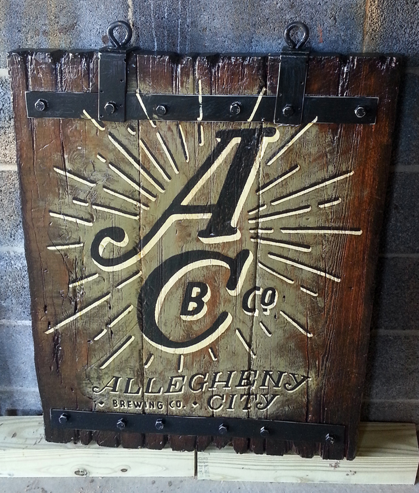 Double-sided blade sign made from reclaimed barn wood + hand-painted logos, Allegheny City Brewing Co., North Side Pgh..