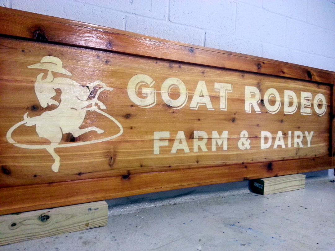 Hand-made cedar wood sign & logo painting, Goat Rodeo, Farm & Dairy…