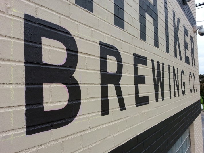 Large outdoor wordmark on brick, Hitchhiker Brewing Co., Sharpsburg, Pa…