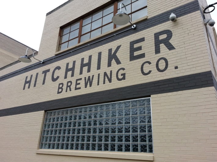 Large outdoor wordmark on brick, Hitchhiker Brewing Co., Sharpsburg, Pa…