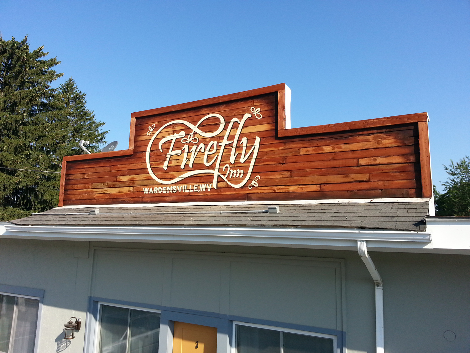 Firefly Inn, Hand-painted logo + wood staining on cedar parapet, Wardensville, WV…