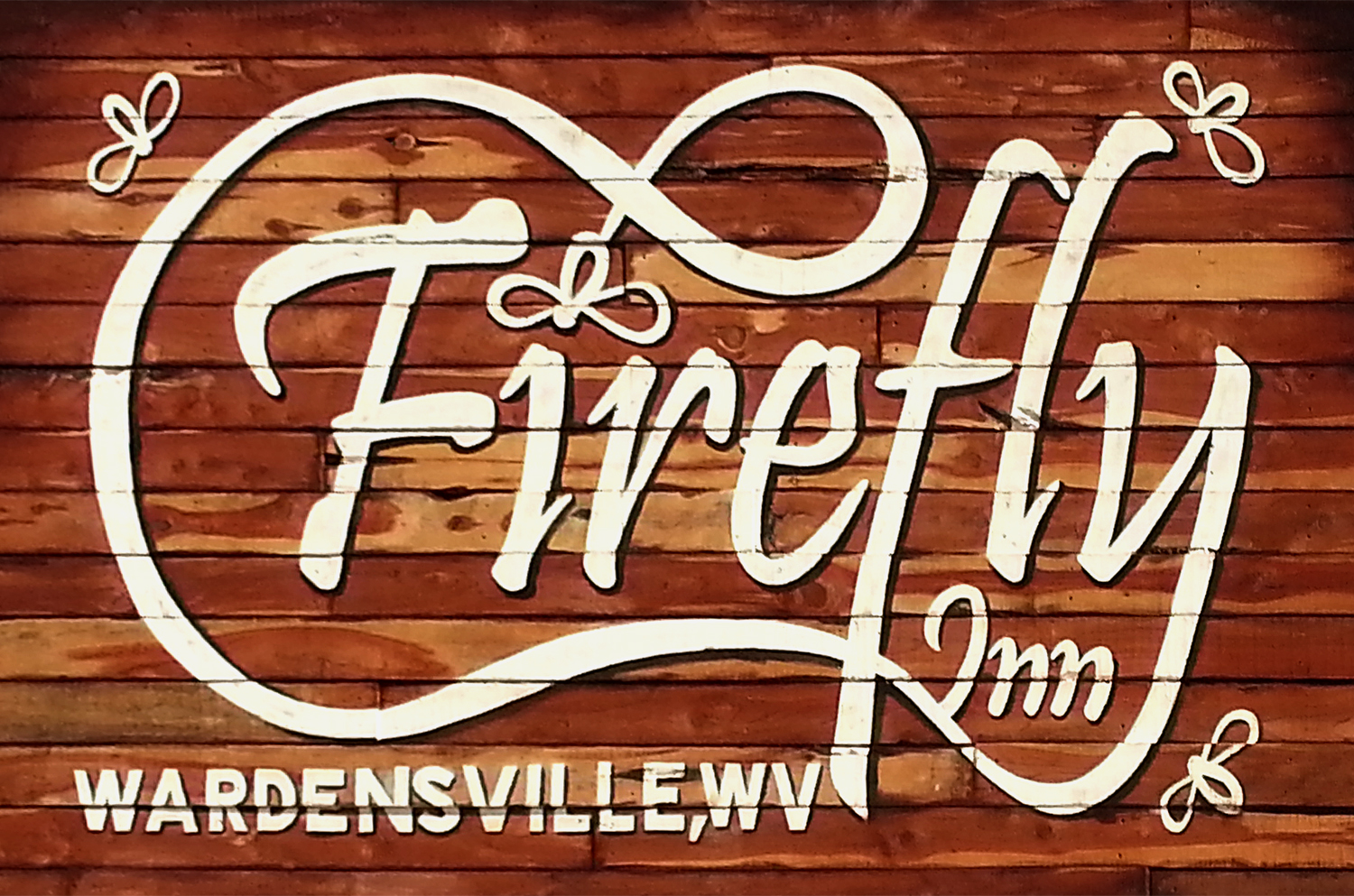 Firefly Inn, Hand-painted logo + wood staining on cedar parapet, Wardensville, WV…