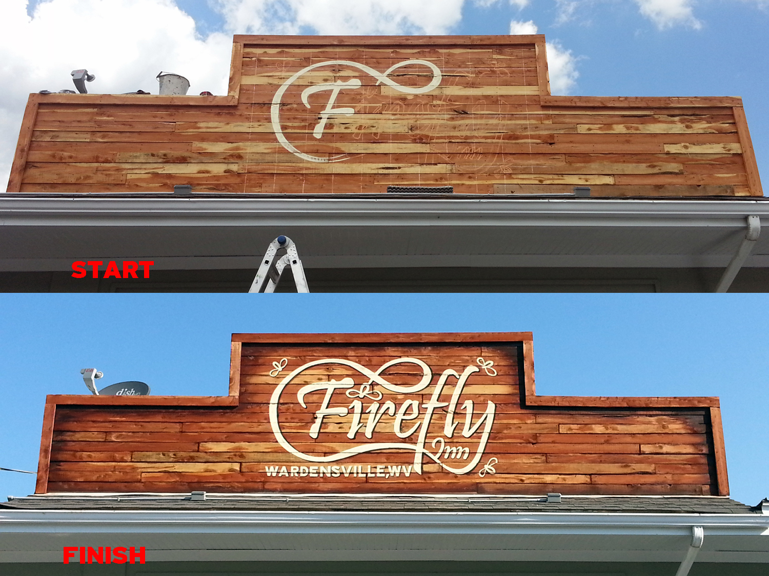 Firefly Inn, Hand-painted logo + wood staining on cedar parapet, Wardensville, WV…