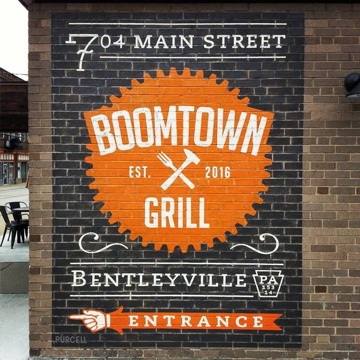 Hand-painted outdoor sign on brick, Boomtown Grill, Bentleyville, Pa…