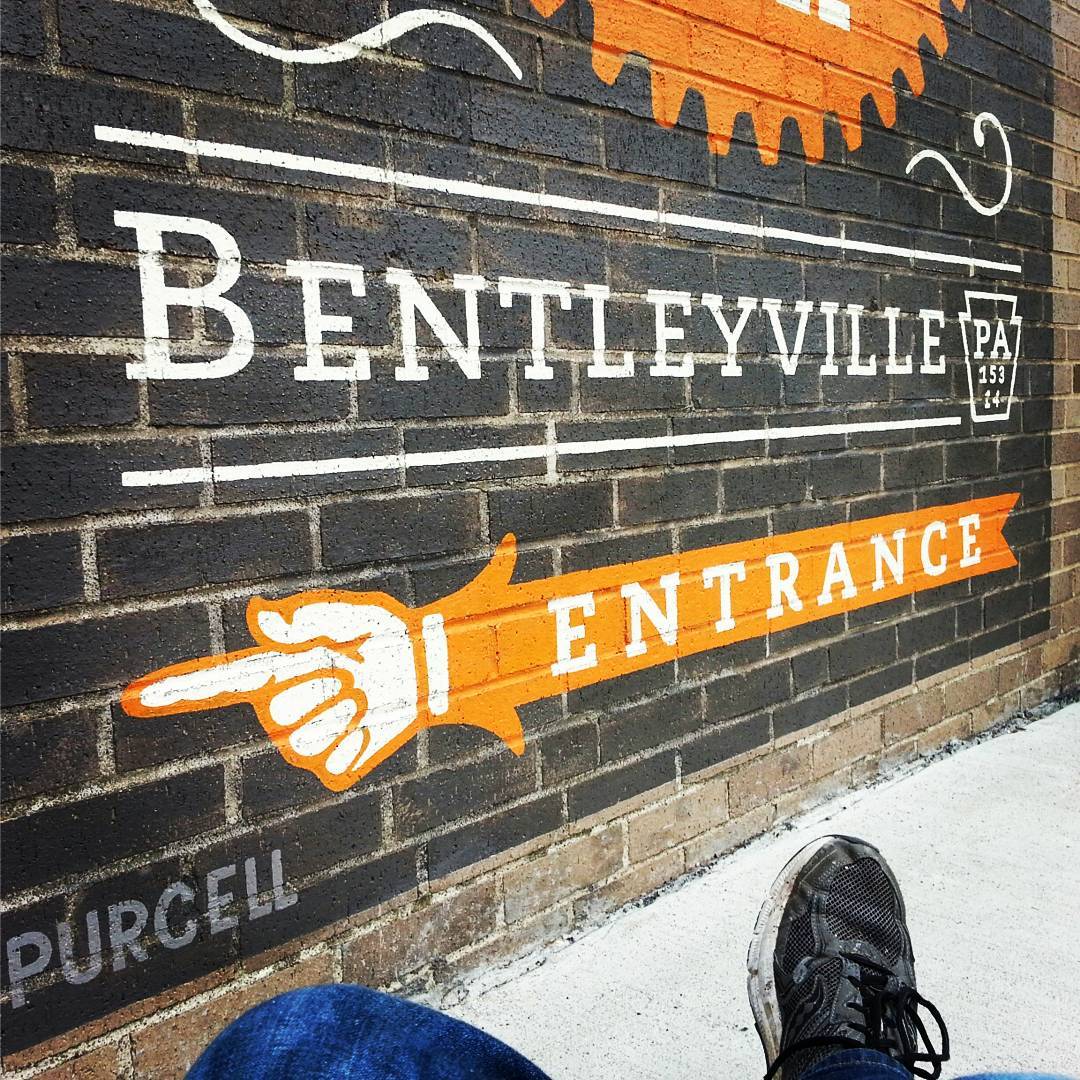 Hand-painted outdoor sign on brick, Boomtown Grill, Bentleyville, Pa…