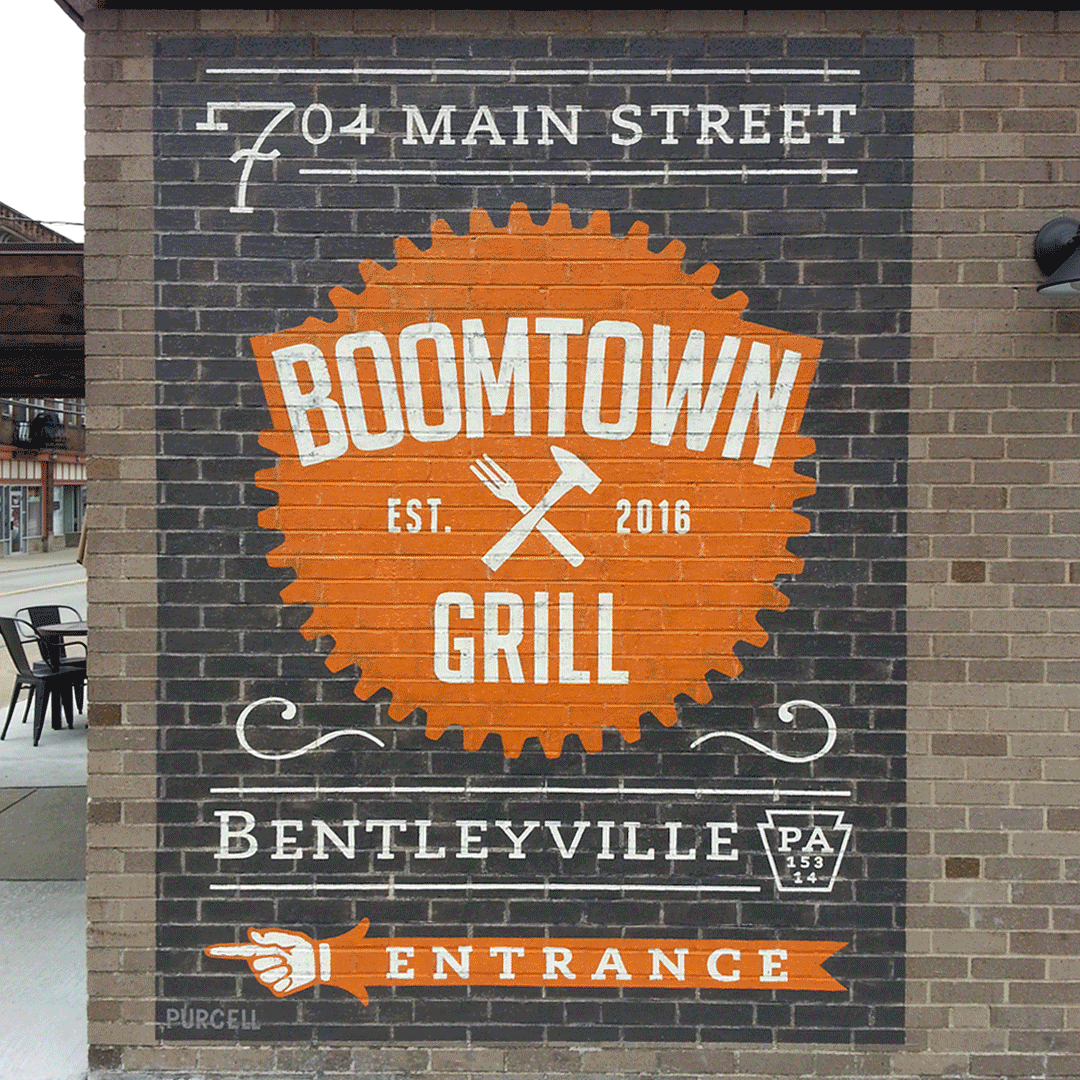 Hand-painted outdoor sign on brick, Boomtown Grill, Bentleyville, Pa…
