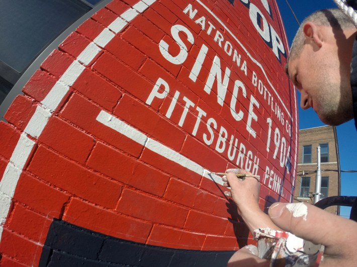 ← Painting a large outdoor sign painted from a suspended bucket, Natrona Bottling Co., The Strip District, Pittsbutgh