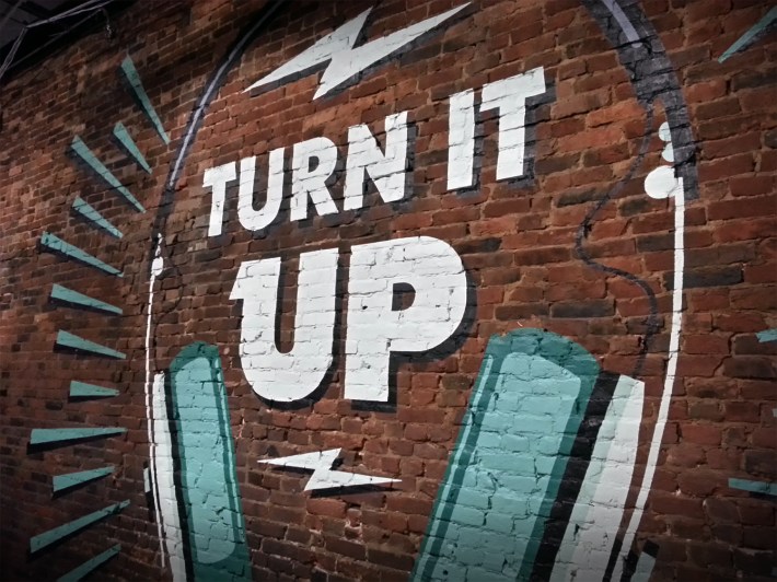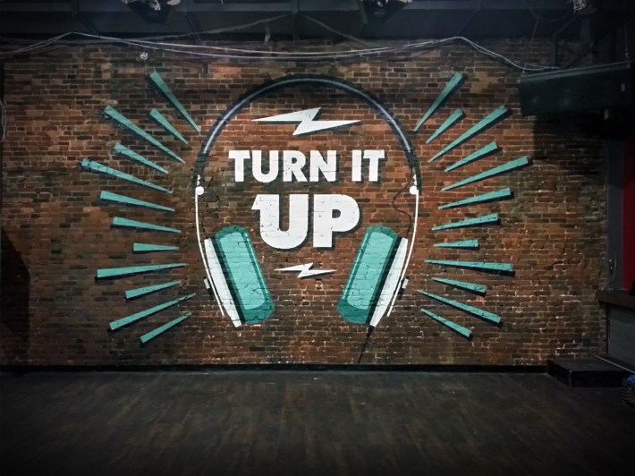 TURN IT UP! ROUGH brick wall mural, Jimmy D’s Nightclub, Southside, Pgh…