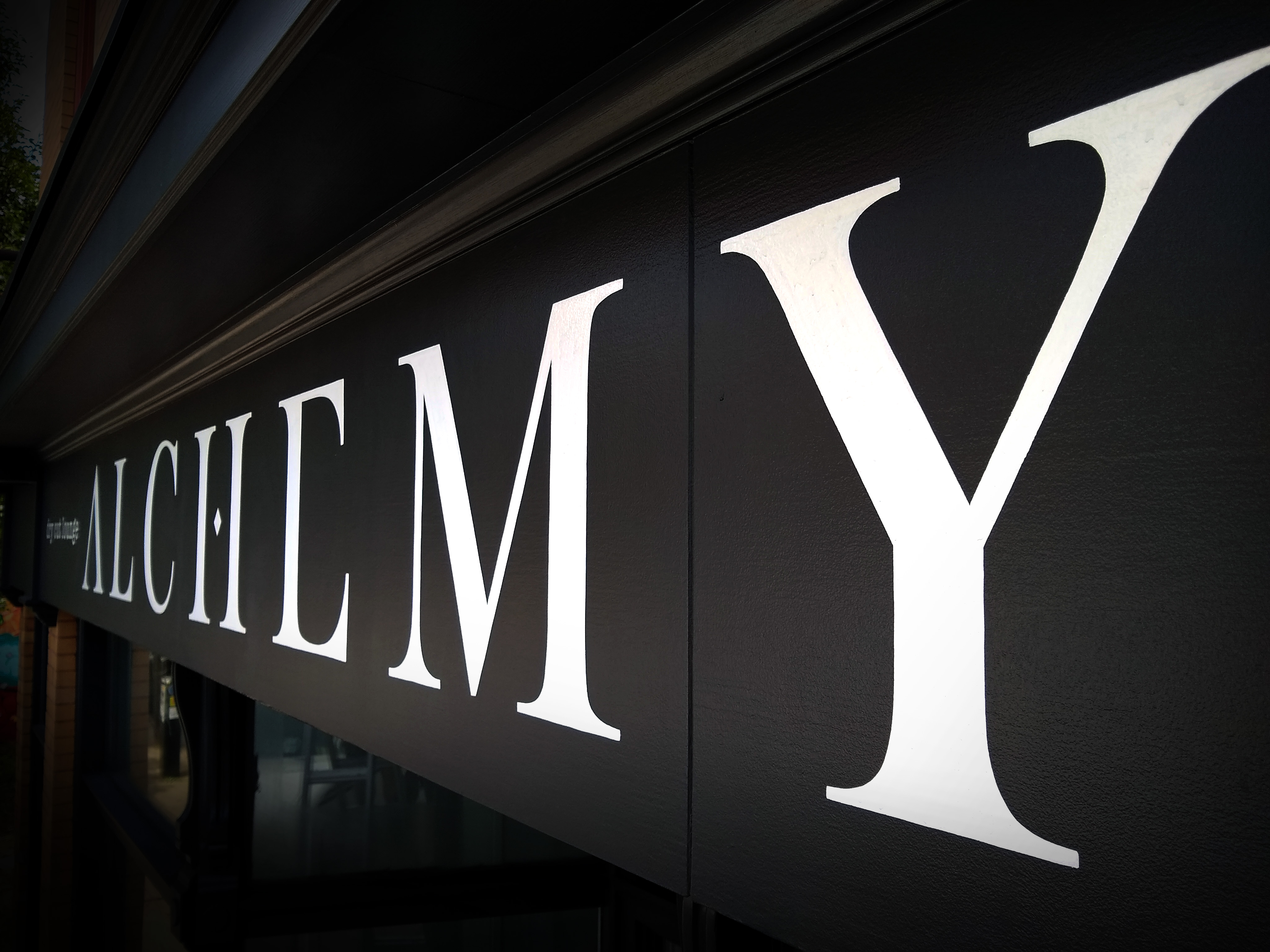 Logo & word mark painting on wood and glass, Alchemy, Dry Cut Lounge, Lawrenceville…