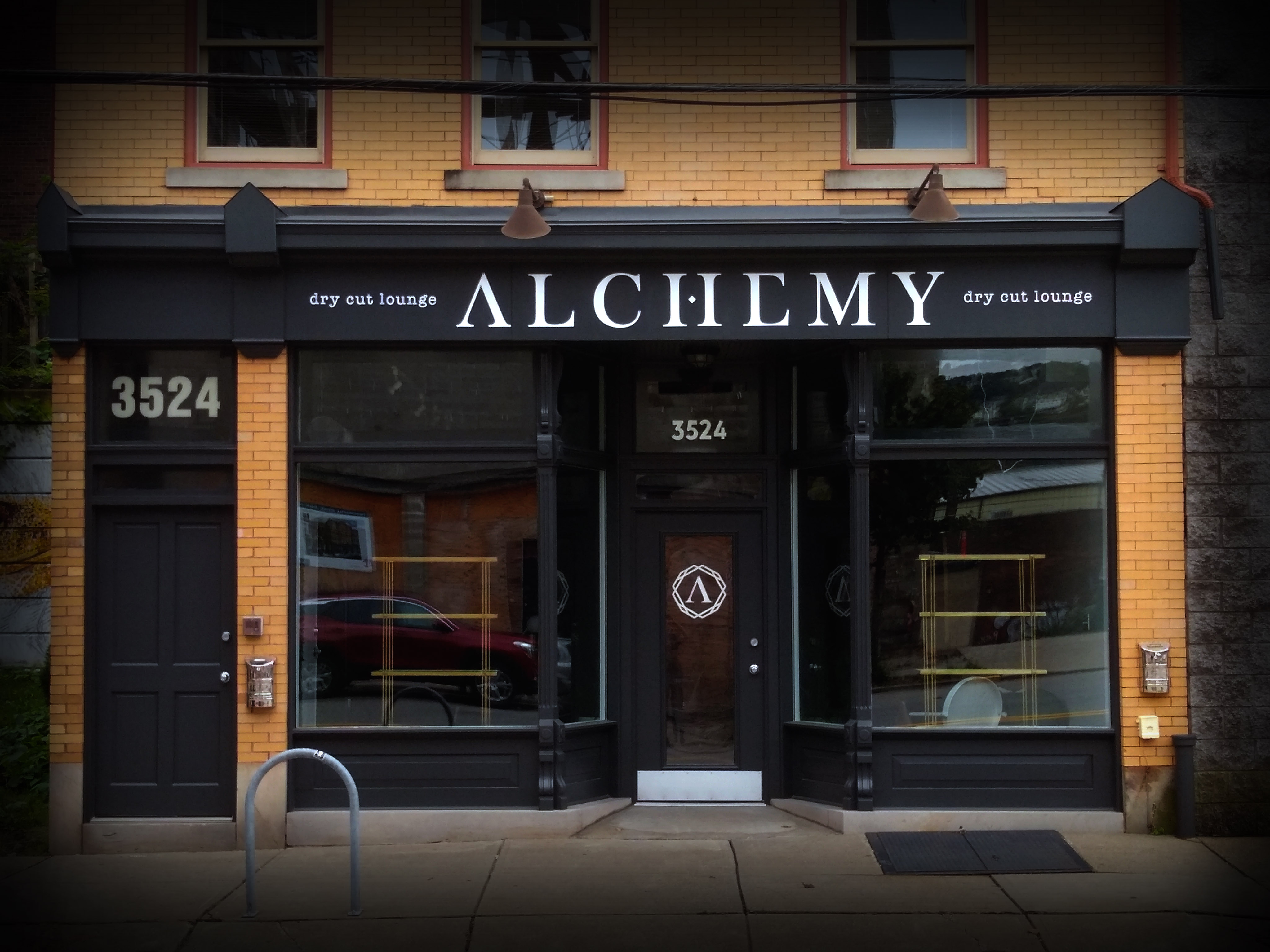 Logo & word mark painting on wood and glass, Alchemy, Dry Cut Lounge, Lawrenceville…