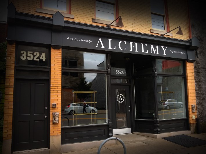 Logo & word mark painting on wood and glass, Alchemy, Dry Cut Lounge, Lawrenceville…
