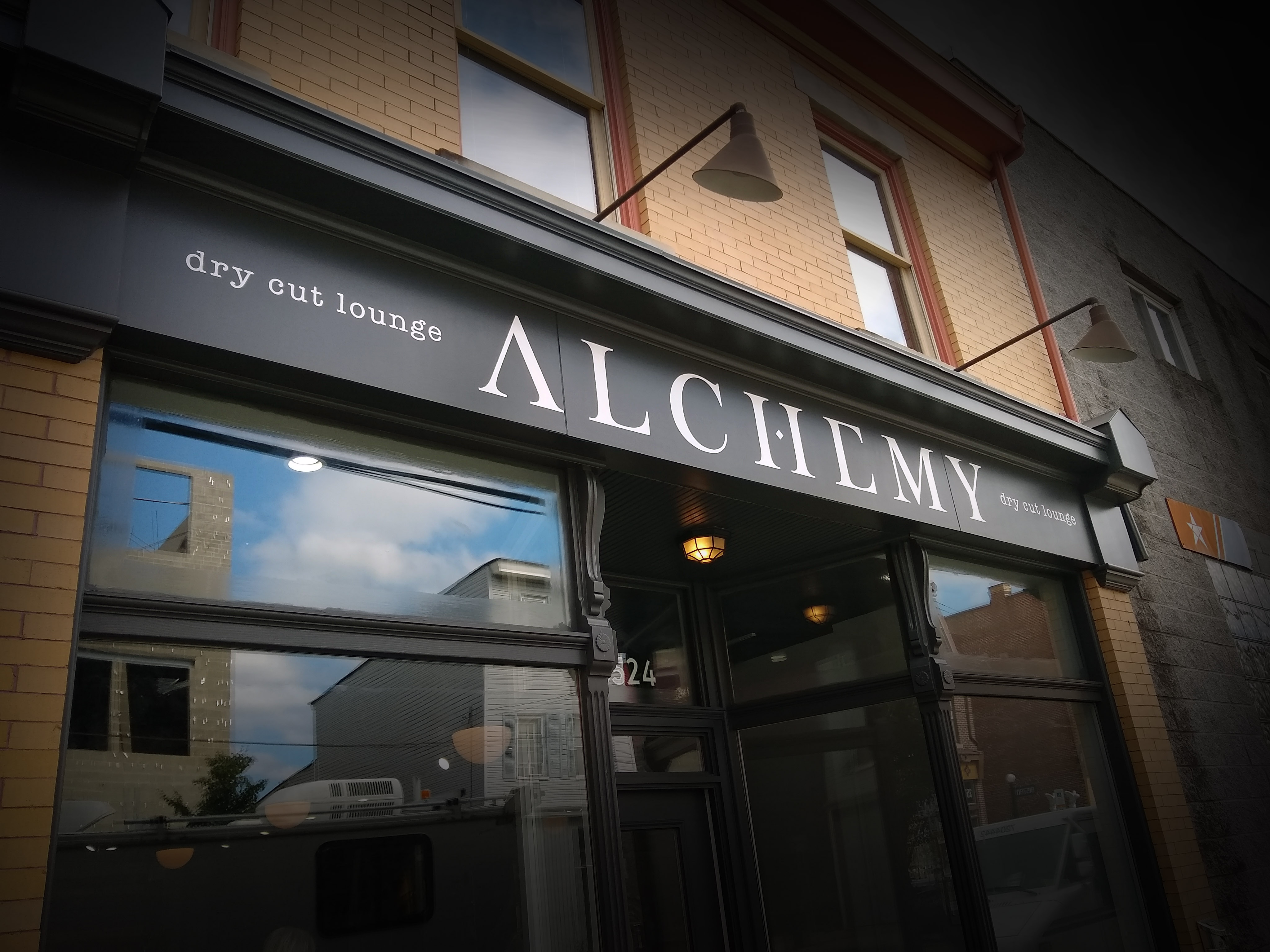 Logo & word mark painting on wood and glass, Alchemy, Dry Cut Lounge, Lawrenceville…