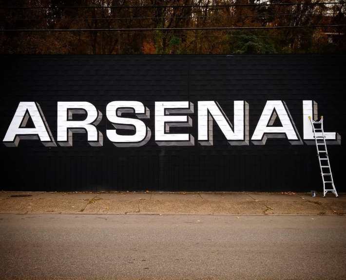 100 ft. of custom 3D typography. Hand-painted sign on highly textured surface, Arsenal Strength, Lawrenceville…