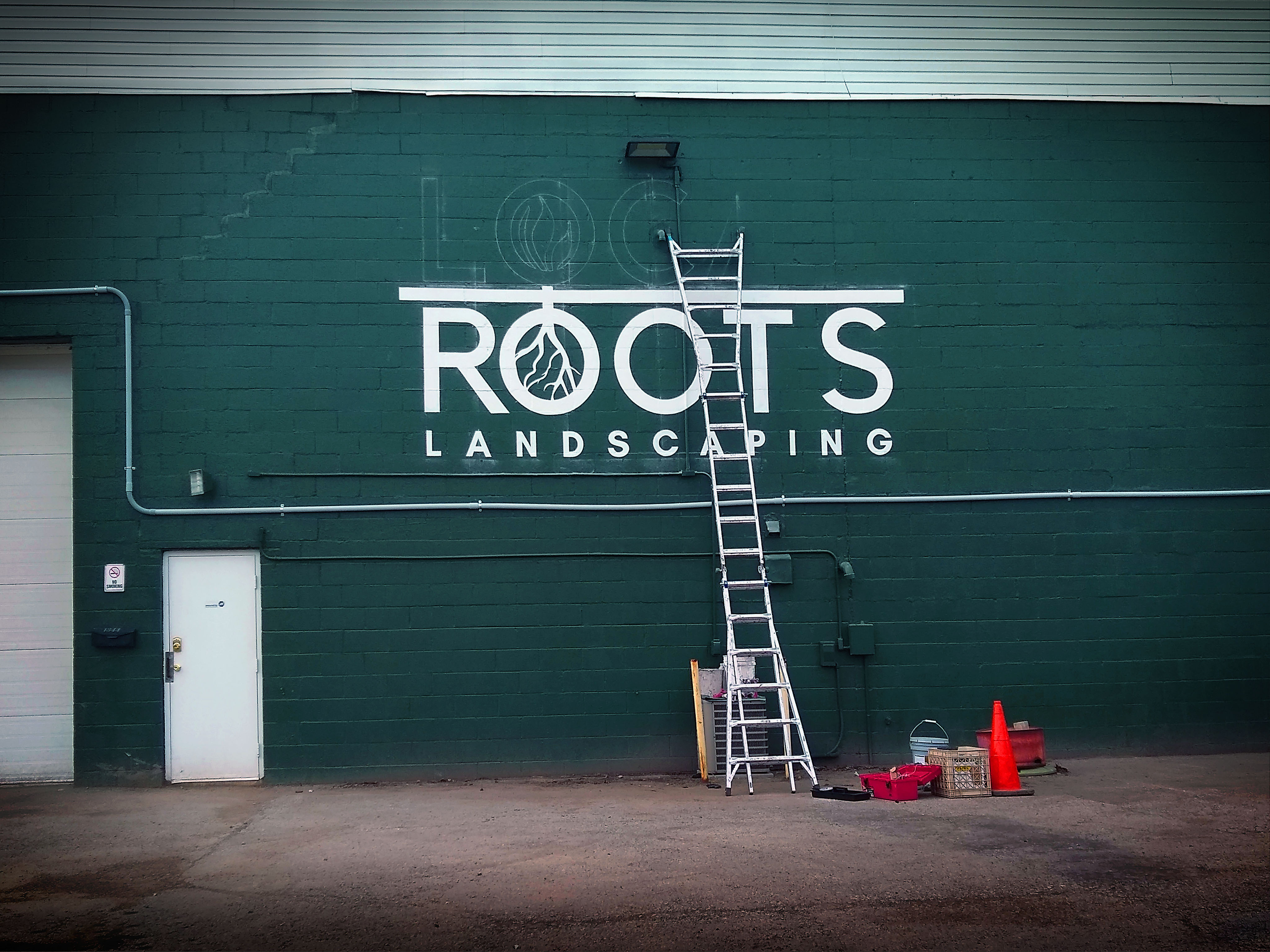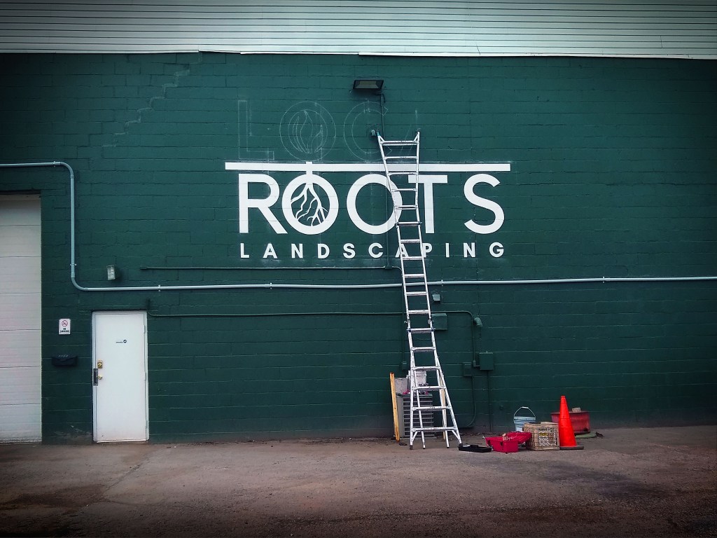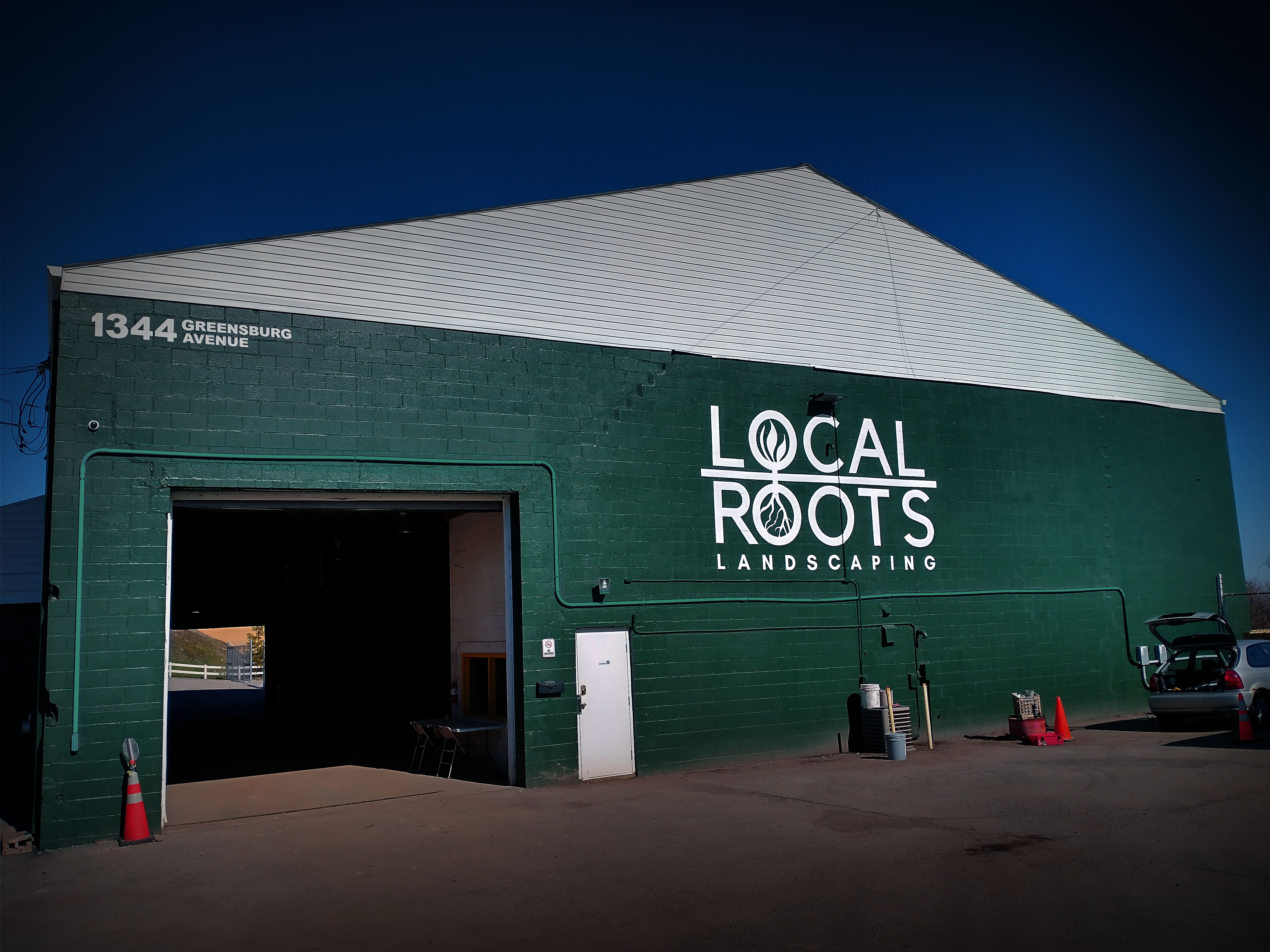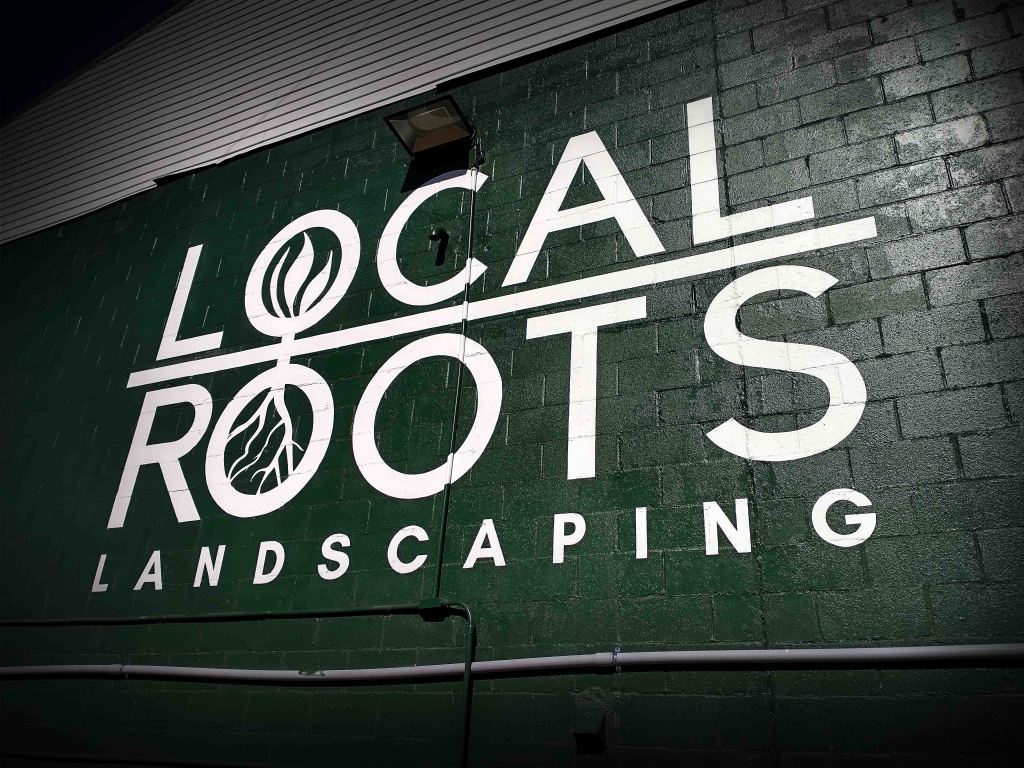 Large, hand-painted logo on block wall, Local Roots Landscaping, North Versailles…