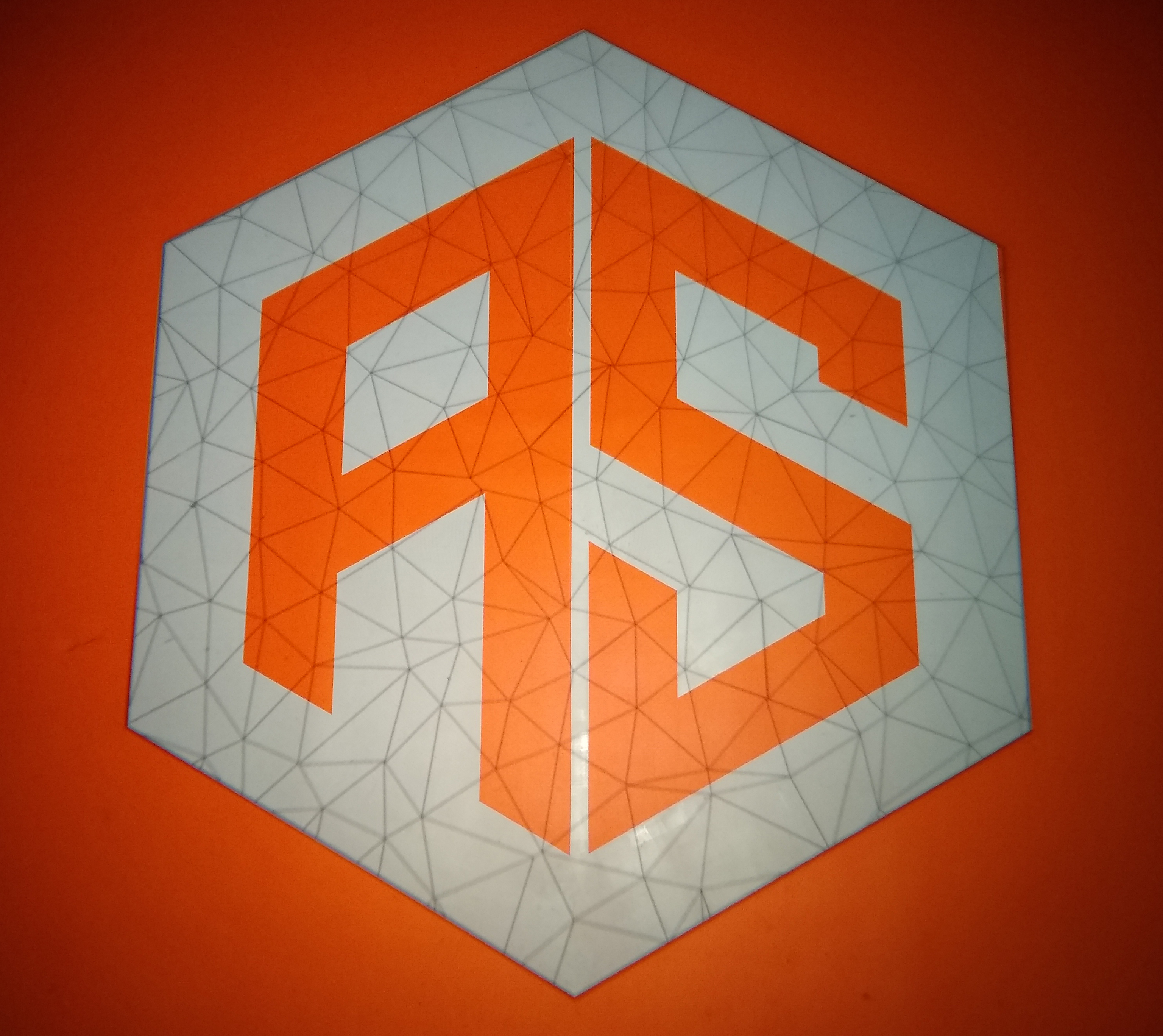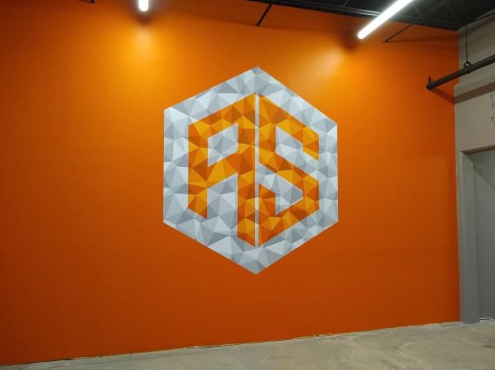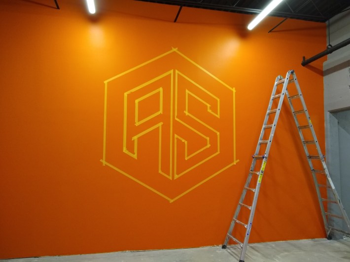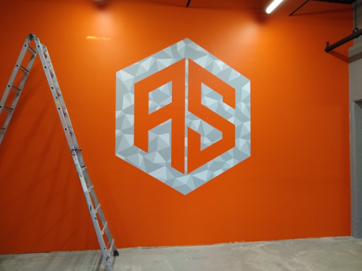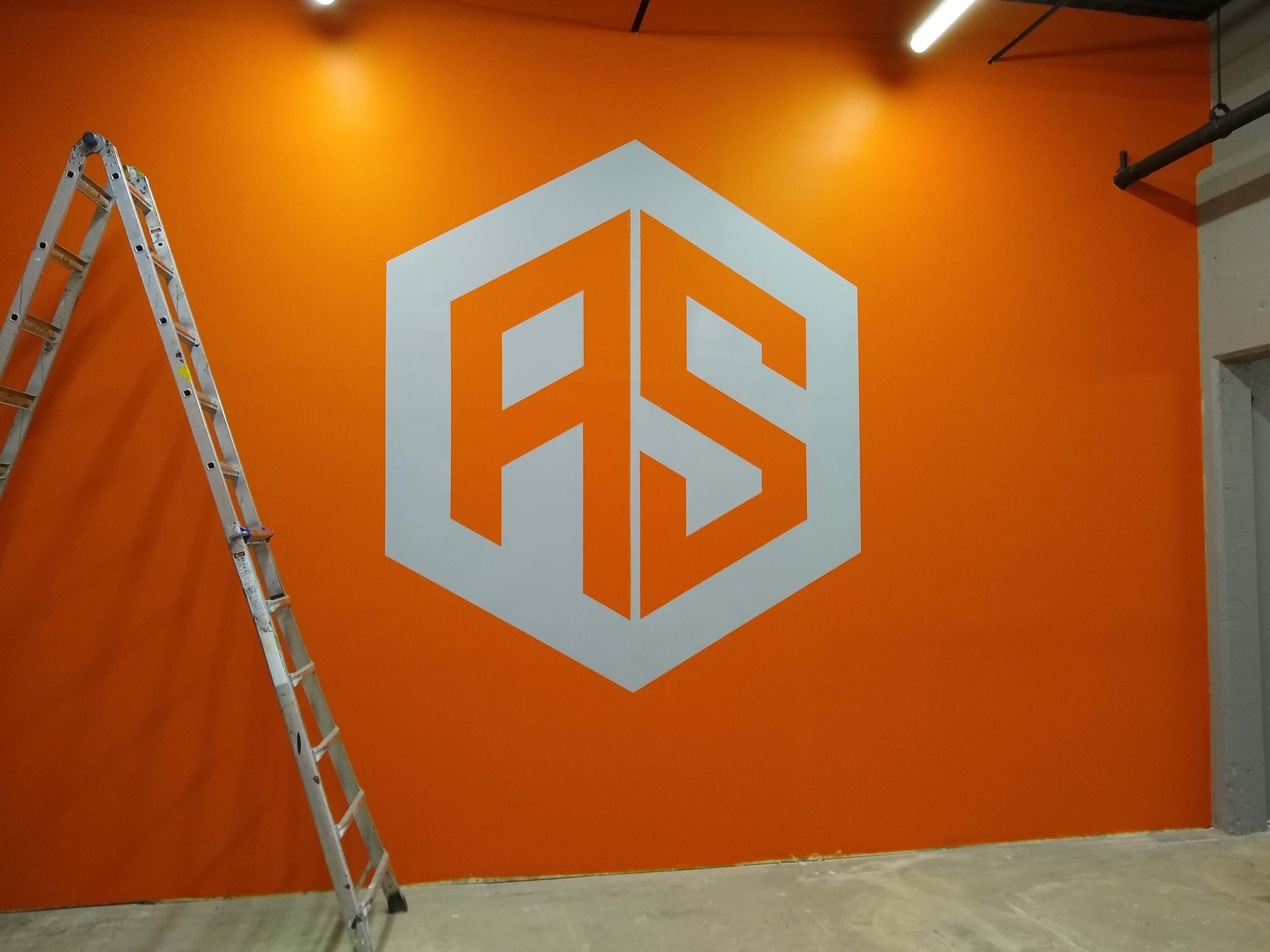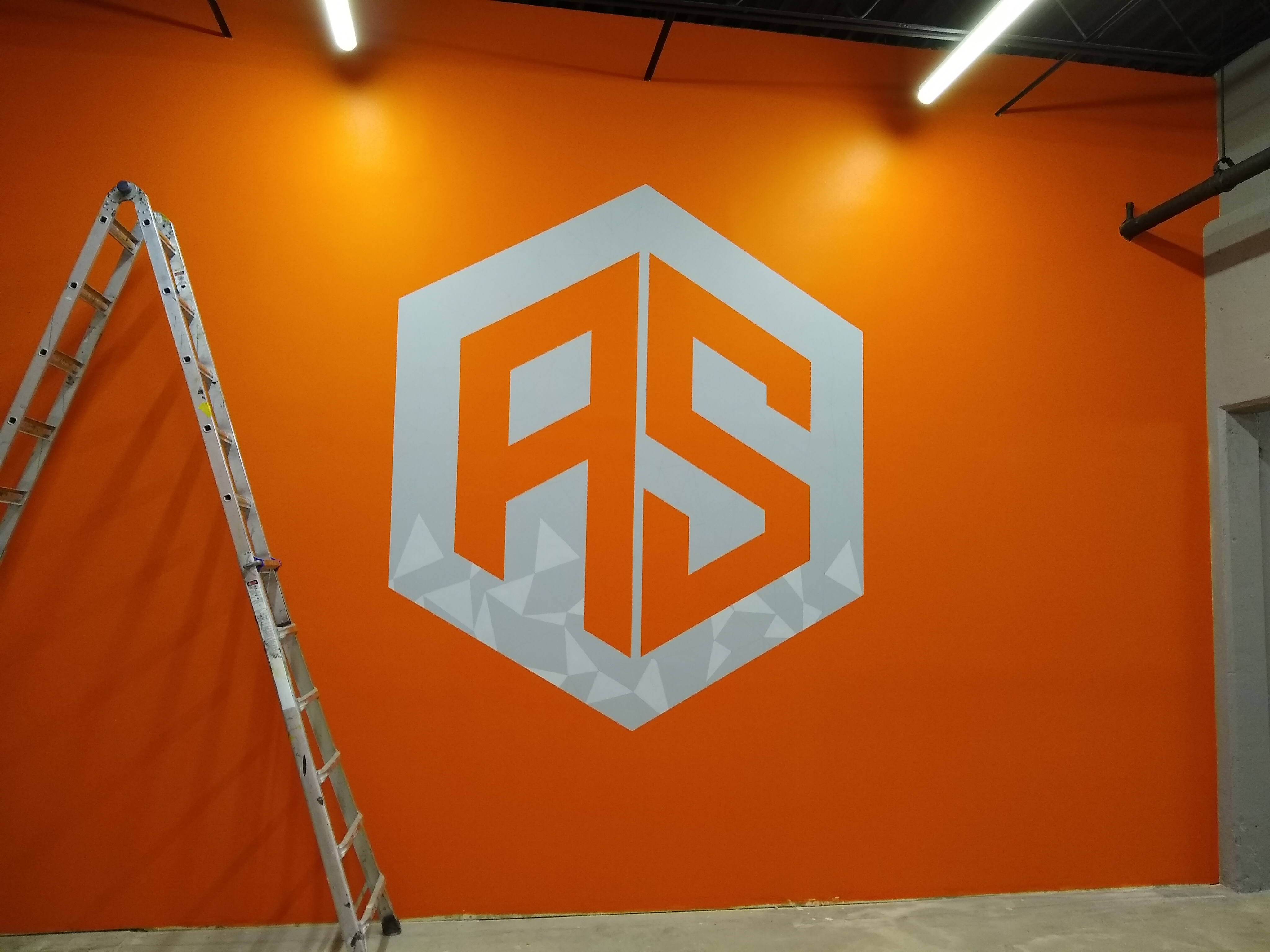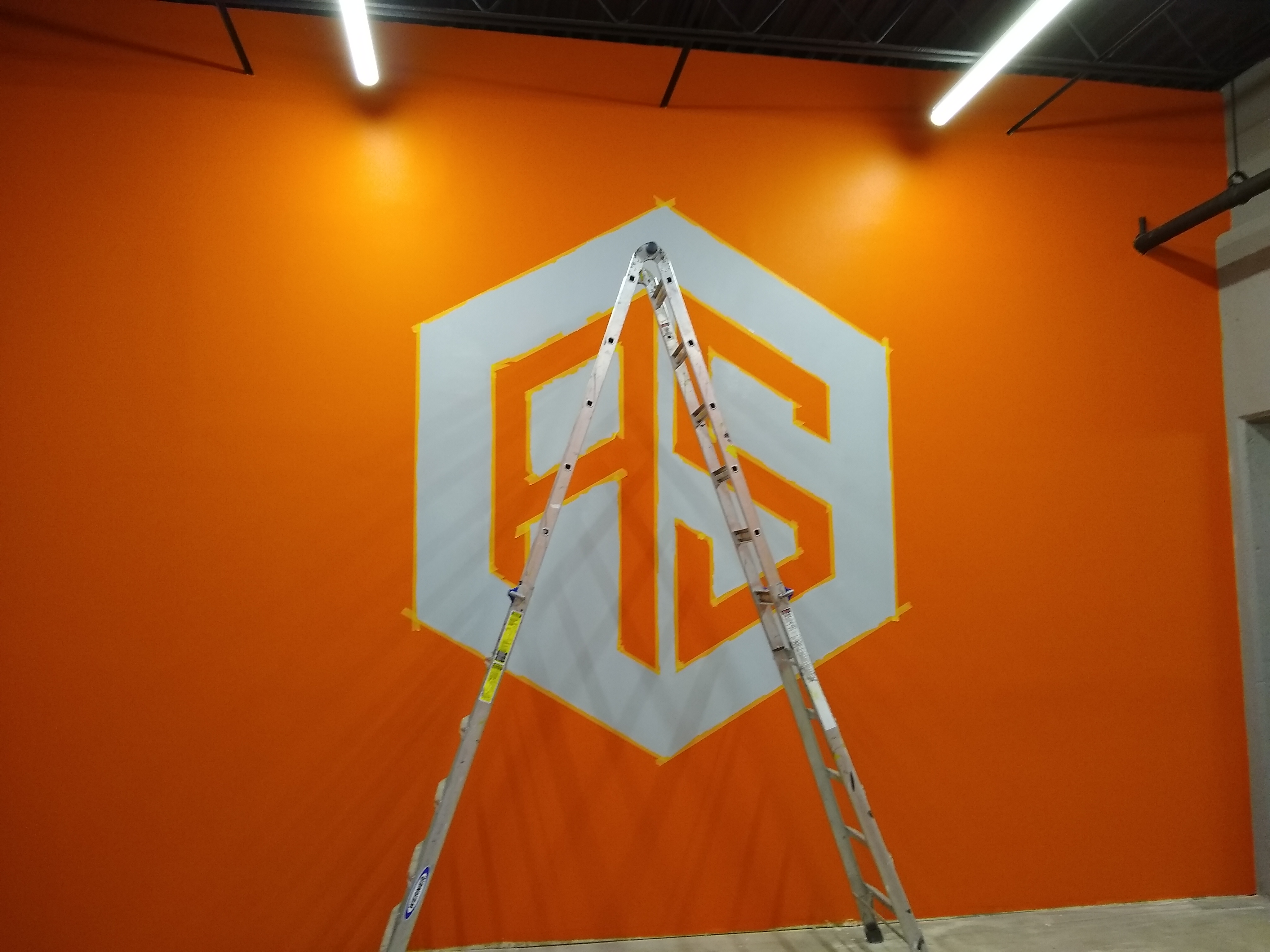 masking out the logo before background painting beginsmasking complete!background paintingPulling off the tape!using light projection to transfer a design!starting to paint the geometric patternalmost done with the background pattern painting and ready to continue on to the letteringpainting the orange geometric patternsPhew, complete!