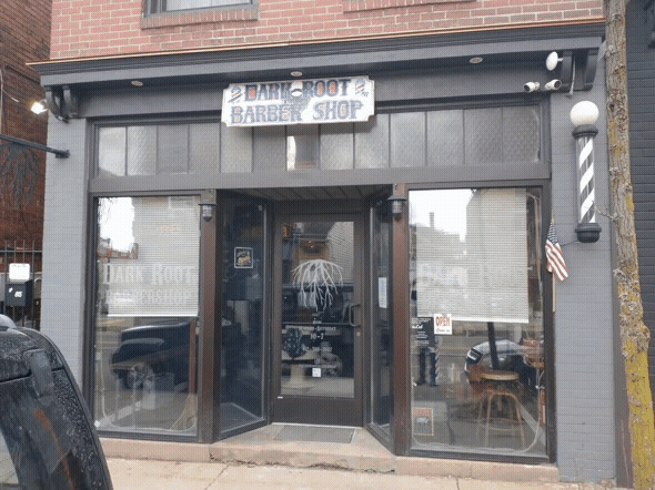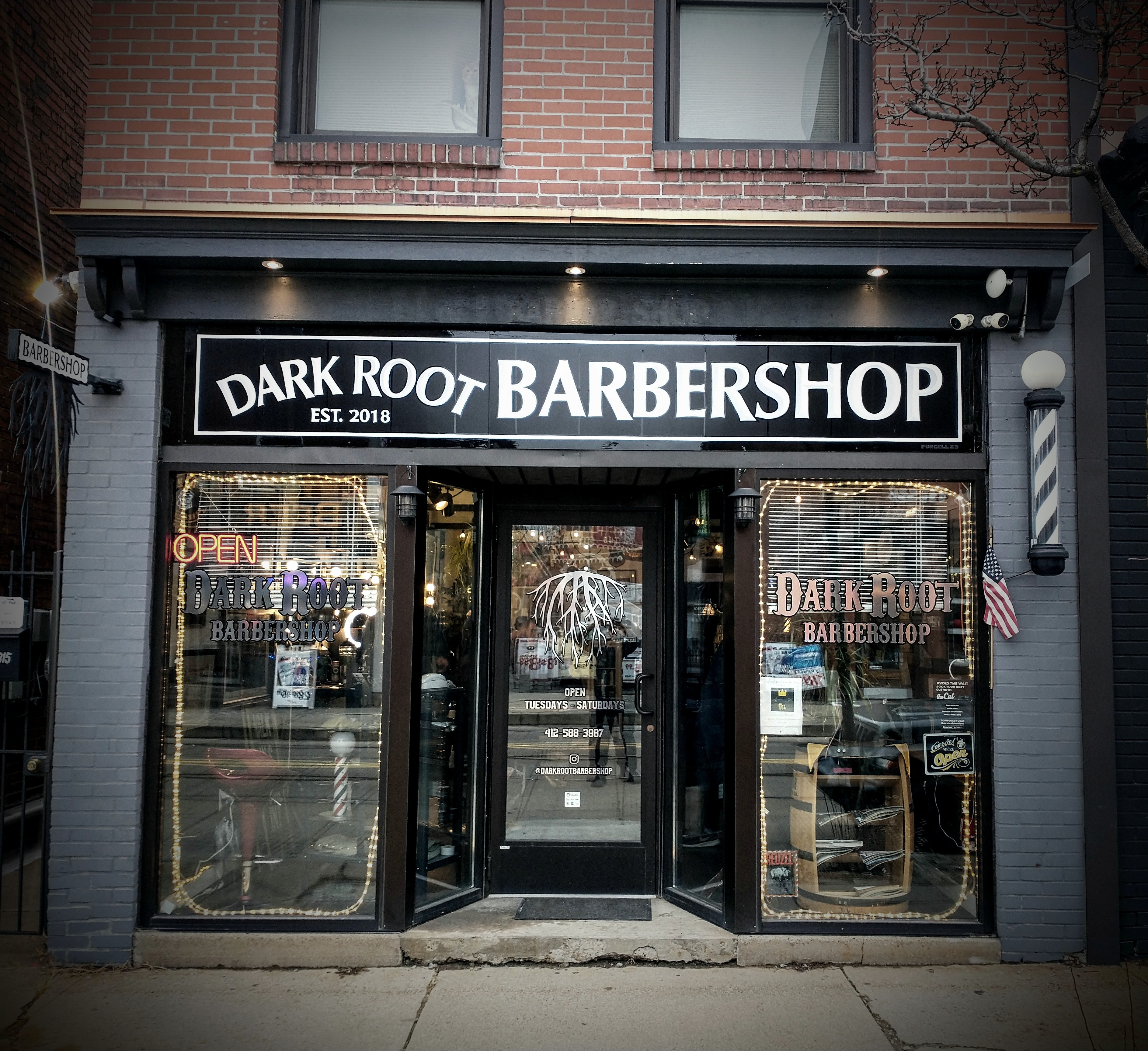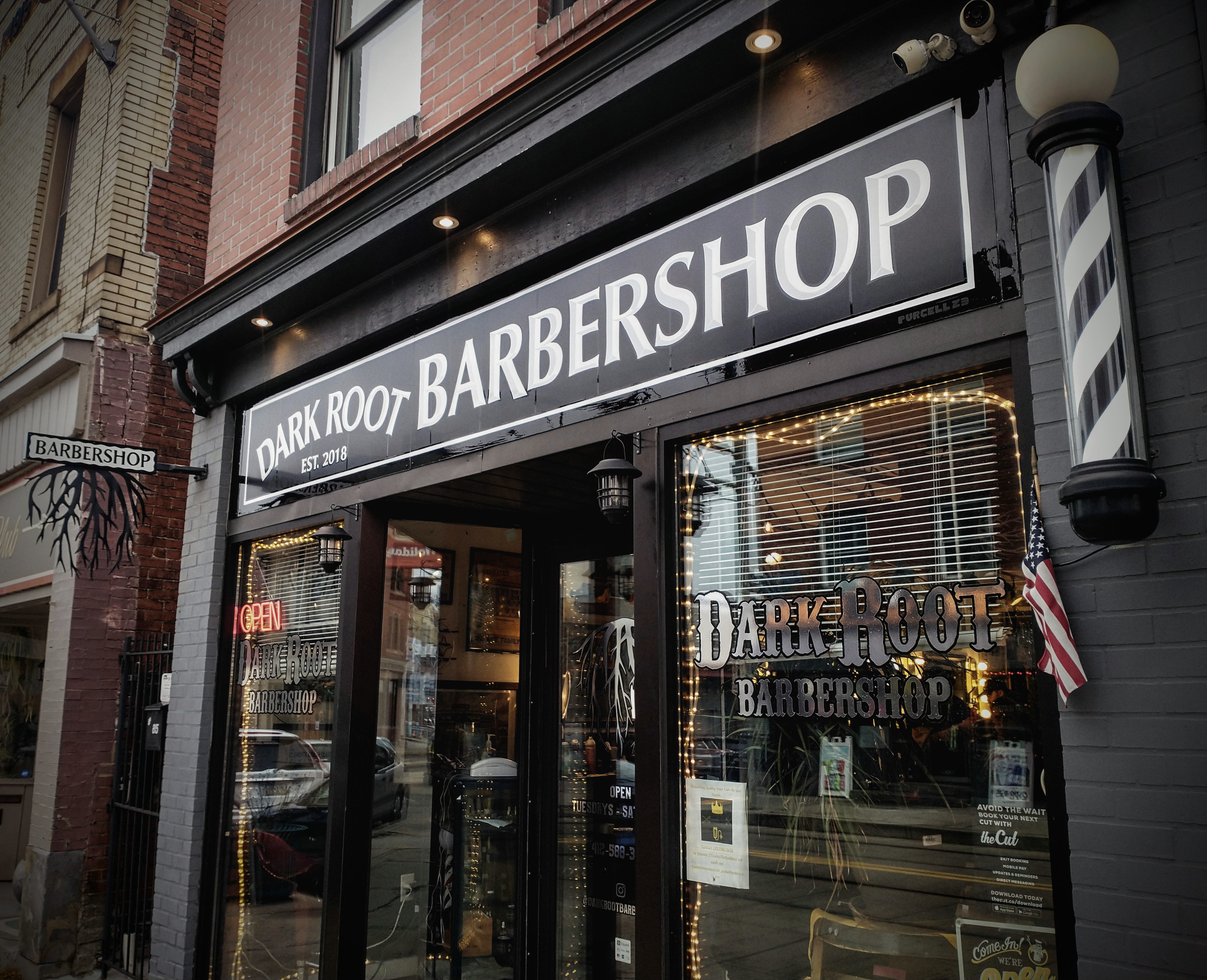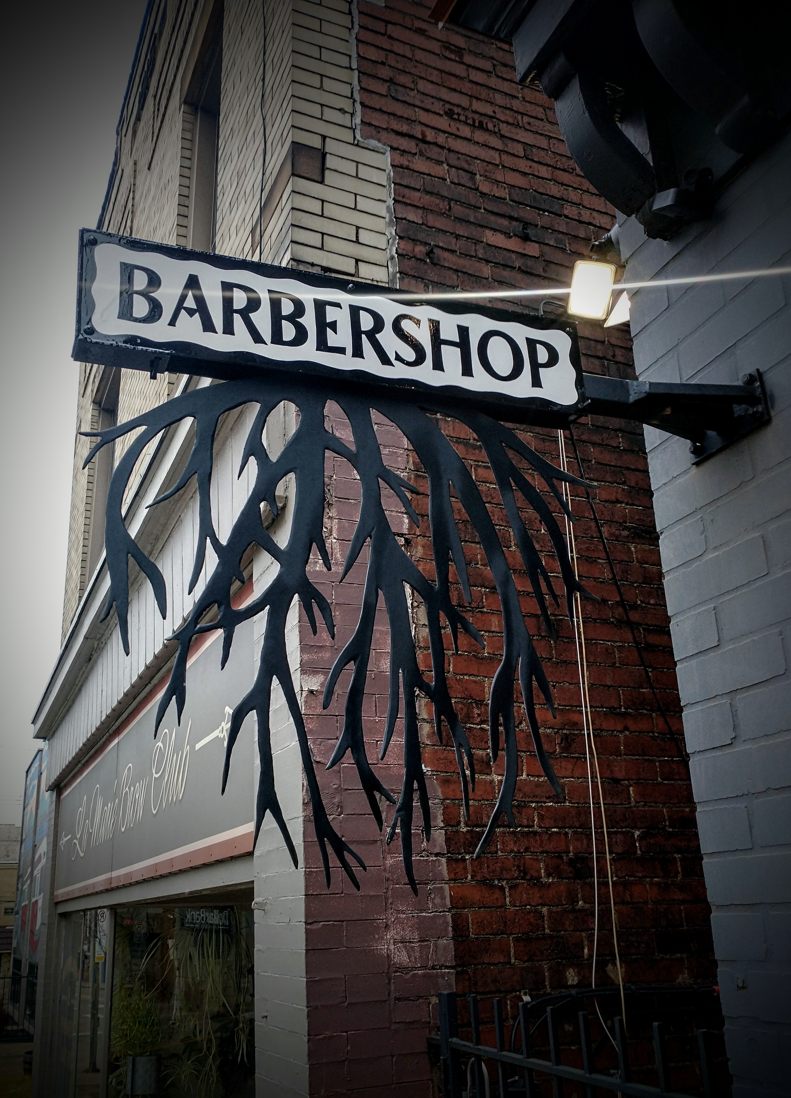 Custom designed and hand-painted signs, Dark Root Barbershop…