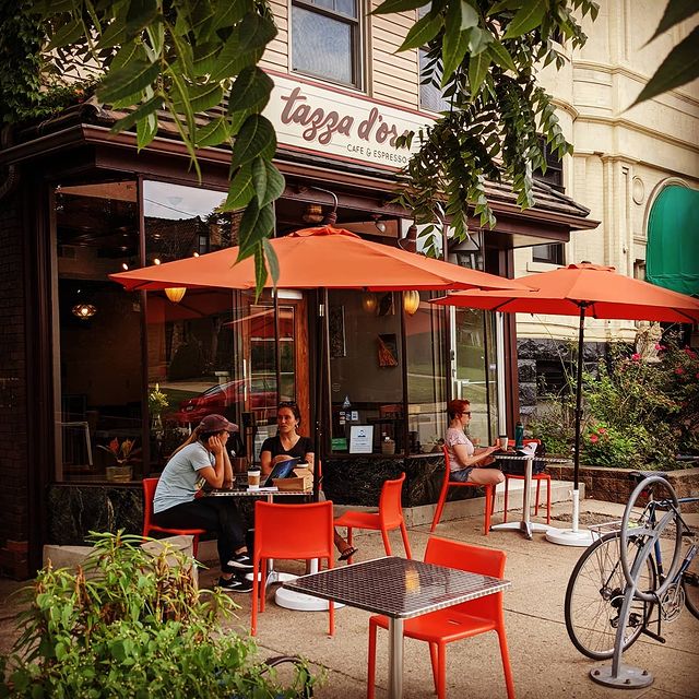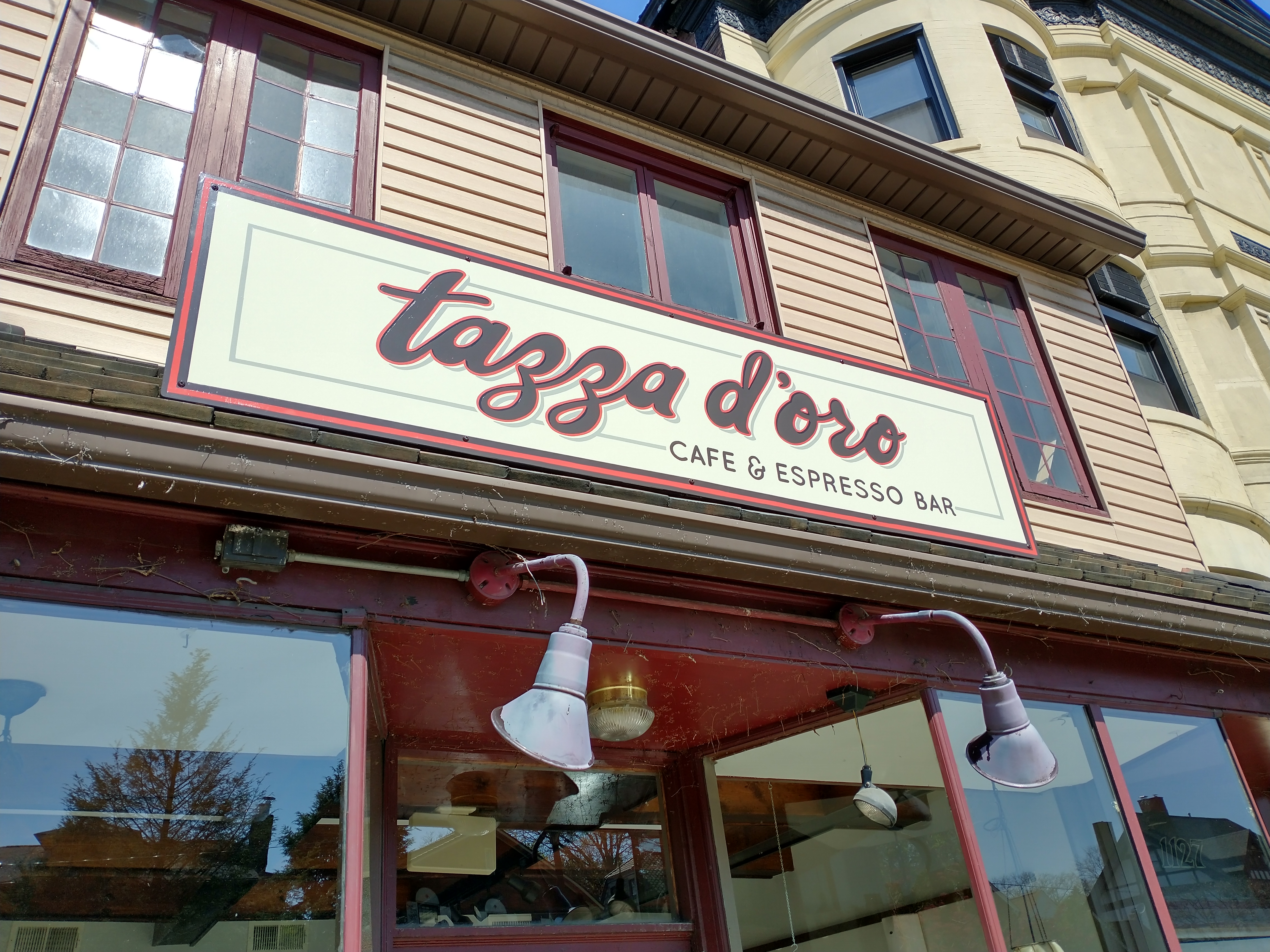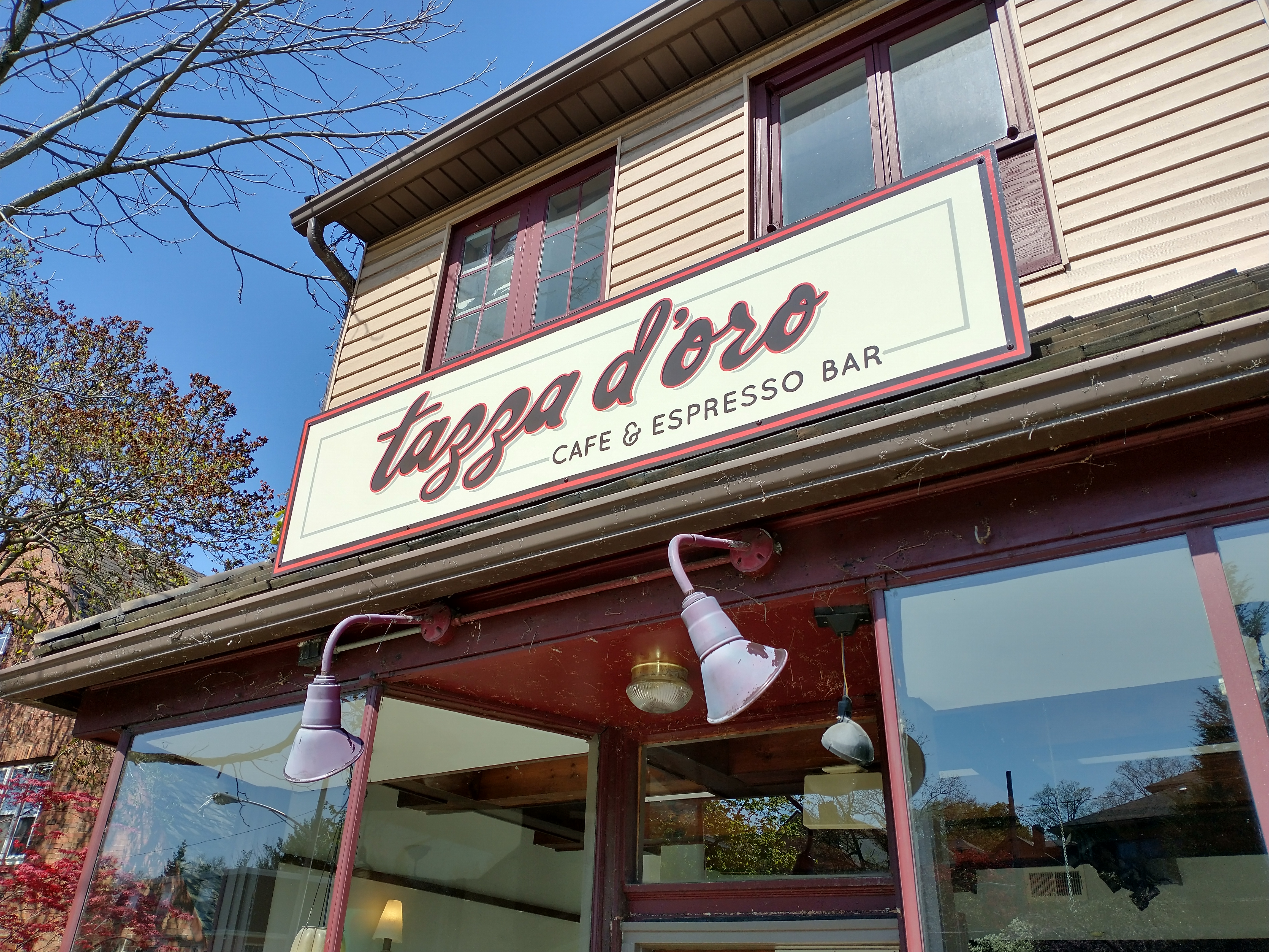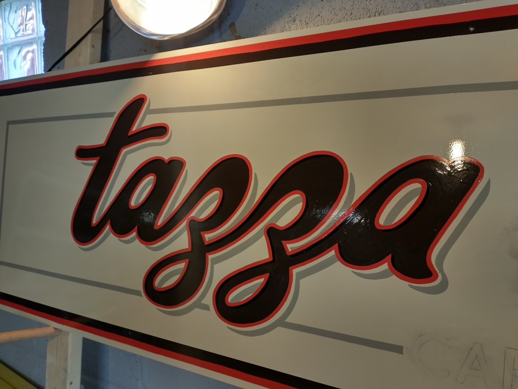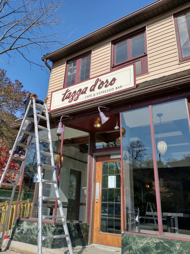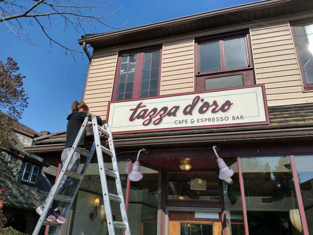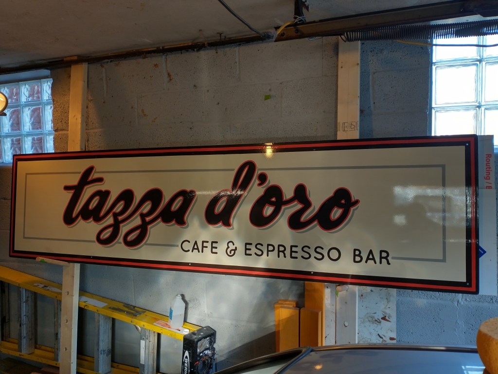 Design, fabrication & installation of a Hand-painted sign, Tazza D’oro, Highland Park…